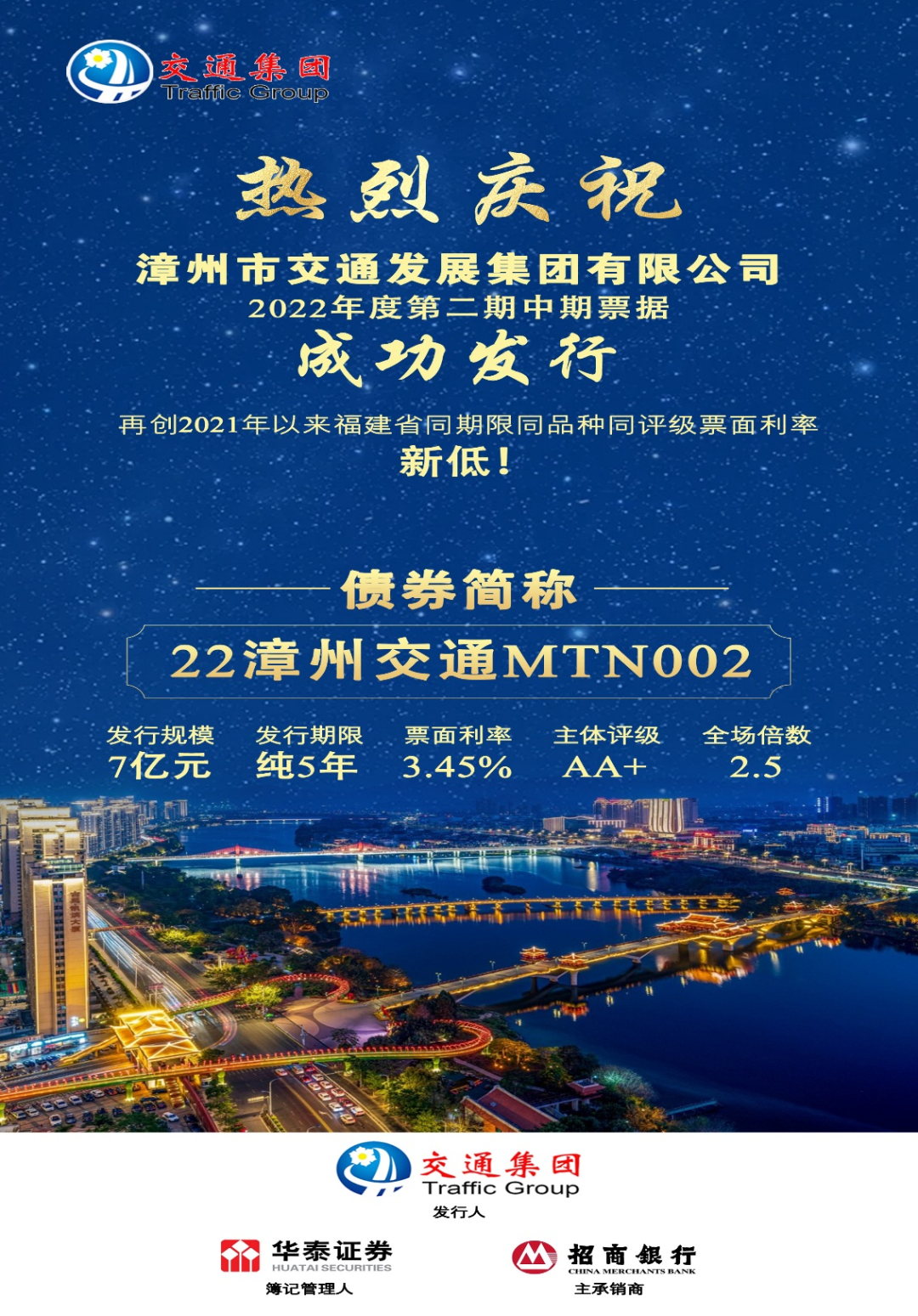 由華泰證券、招商銀行主承的漳州交通集團(tuán)2022年度第二期中期票據(jù),2022年10月20日由簿記發(fā)行,發(fā)行規(guī)模7億元,期限5年,票面利率3.45%,認(rèn)購(gòu)倍數(shù)2.5倍。